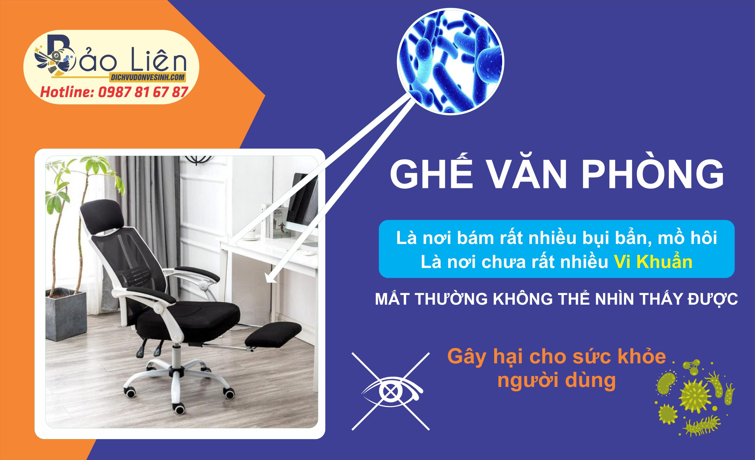 - Để lâu dần khiến các lớp bụi bẩn và các lớp ố vàng bám chặt vào ghế. Đây cũng là môi trường yêu thích của VI KHUẨN. Đặc biệt với không gian khép kín như văn phòng, không khí ít lưu thông và ít ánh sáng mặt trời sẽ là “điều kiện thuận lợi” để vi khuẩn sinh sôi nảy nở. Lâu dần tạo thành một “ổ vi khuẩn khổng lồ” – tác nhân cực kỳ hại cho sức khỏe con người và môi trường làm việc.➡ Vì vậy chỉ cần ghế văn phòng SỬ DỤNG LÂU NGÀY đều cần phải giặt, vệ sinh sạch sẽ để đánh bay mọi vi khuẩn, góp phần bảo vệ sức khỏe cho nhân viên cũng như giữ ghế mới lâu hơn.