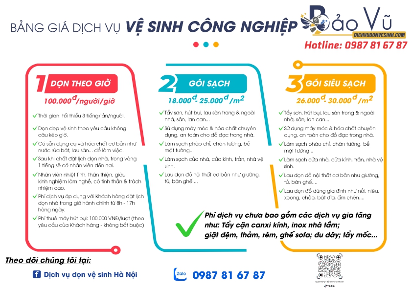 Dưới đây là bảng báo giá tham khảo dịch vụ vệ sinh do Bảo Vũ cung cấp với đội ngũ nhân viên nhiệt tình, lành nghề, chuyên nghiệp kết hợp với máy móc hiện đại và các loại hóa chất chuyên dụng, an toàn, đảm bảo chất lượng dịch vụ ở mức tốt nhất.